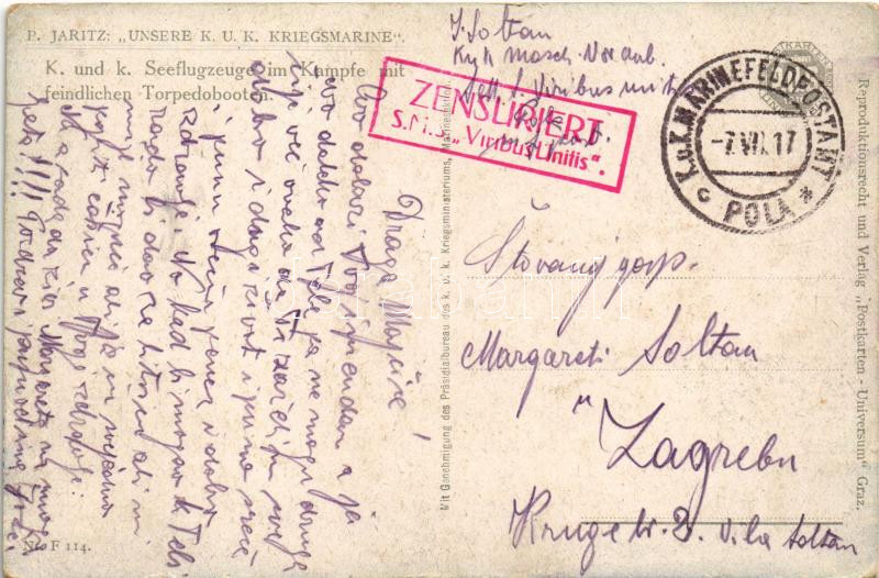 Description: 1917 K. und k. Seeflugzeug im Kampfe mit feindlichen Torpedobooten, Seeflugzeug. Unsere K.u.K. Kriegsmarine P.U.G. Nr. F. 114. / Austro-Hungarian navy postacard, seaplane, hydroplane s: P. Jaritz + "ZENSURIERT S.M.S. "Viribus Unitis" (EK)