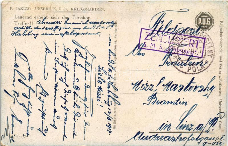 Description: 1917 Lauernd erhebt sich das Periskop Treffer! Unsere K.u.K. Kriegsmarine P.U.G. Nr. F. 116. / Austro-Hungarian navy postacard s: P. Jaritz (EK) + "ZENSURIERT S.M.S. "Habsburg" (EK)