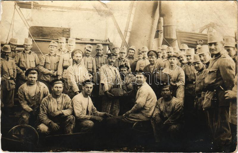 Description: ~1900 K.u.K. Kriegsmarine Matrosen / Osztrák-magyar matrózok és katonák szénnel a fedélzeten / Austro-Hungarian Navy mariners and soldiers on deck, coal loading. photo (fl)