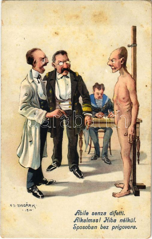 Alkalmas! Hiba nélkül / Abile senza difetti / Sposoban bez prigovora / K.u.K. Kriegsmarine Matrosenhumor / Austro-Hungarian mariner humour art postcard. C. Fano 1914/15. 19. s: Ed. Dworak (fl)