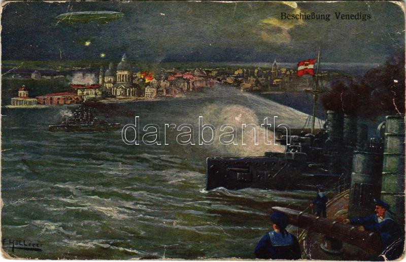 Description: Az Osztrák-Magyar Haditengerészet Velence bombázásánál / Beschießung Venedigs. K.u.K. Kriegsmarine / WWI Austro-Hungarian Navy art postcard, Bombing of Venice s: F. Höllerer (small tear)