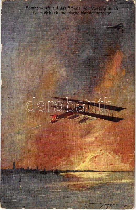Description: Bombenwürfe auf das Arsenal von Venedig durch österreichisch-ungarische Marineflugzeuge. K.u.K. Kriegsmarine Seeflugzeug / WWI Austro-Hungarian Navy art postcard, seaplanes, naval aircrafts, hydroplane. B.K.W.I. 259-164. s: Harry Heusser