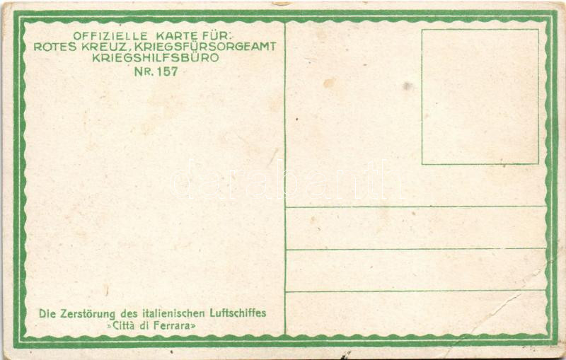 Description: Die Zerstörung des italienischen Luftschiffes "Citta de Ferrara". K.u.K. Kriegsmarine Seeflugzeug. Offizielle Karte für Rotes Kreuz. Kriegsfürsorgeamt Kriegshilfsbüro Nr. 157. / WWI Austro-Hungarian Navy seaplane s: Harry Heusser (EB)