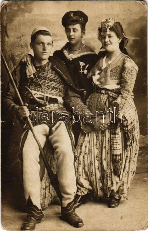 Hölgy osztrák-magyar haditengerészeti matróz egyenruhában kitüntetésekkel, dalmát népviselet / K.u.k. Kriegsmarine / Lady in Austro-Hungarian Navy mariner's uniform, Dalmatian folklore. photo (szakadások / tears)