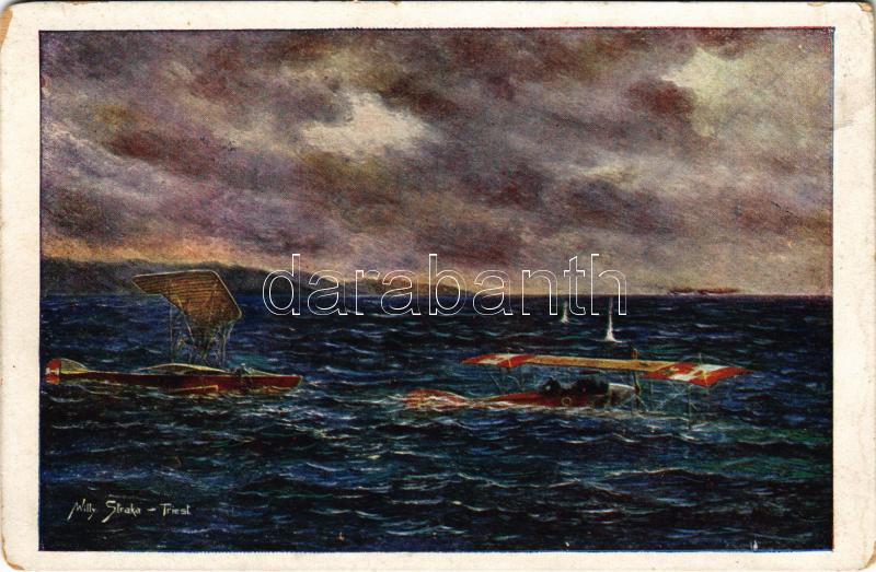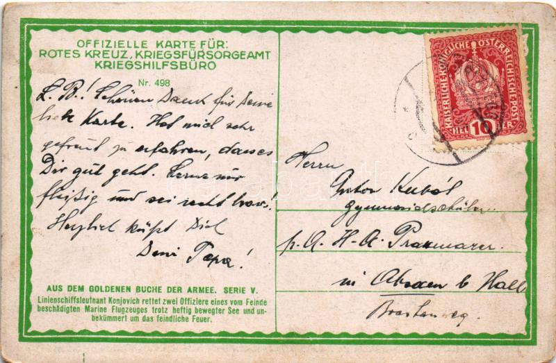Description: Linienschiffsleutnant Konjovich rettet zwei Offiziere eines vom Feinde beschädigten Marine Flugzeuges. K.u.K. Kriegsmarine, Aus dem goldenen Buche der Armee Serie V. Offizielle Karte für Rotes Kreuz, Kriegsfürsorgeamt, Kriegshilfsbüro Nr. 498. / WWI Austro-Hungarian Navy seaplanes s: Willy Straka (EK)
