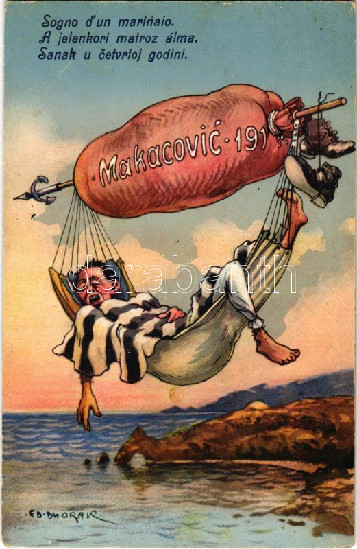 Description: Makacovic 1914. A jelenkori matróz álma / Sogno d'un marinaio / Sanak u cetvrtoj godini / K.u.K. Kriegsmarine Matrose / Austro-Hungarian Navy mariner humour art postcard. C. Fano 1914/15. 28. s: Ed. Dworak (fl)