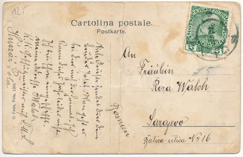 SMS HUSZÁR az Osztrák-Magyar Haditengerészet Huszár-osztályú rombolója / K.u.K. Kriegsmarine Torpedoboot-Zerstörer / Austro-Hungarian Navy torpedo destroyer. G. Fano Pola 1908. (fa)