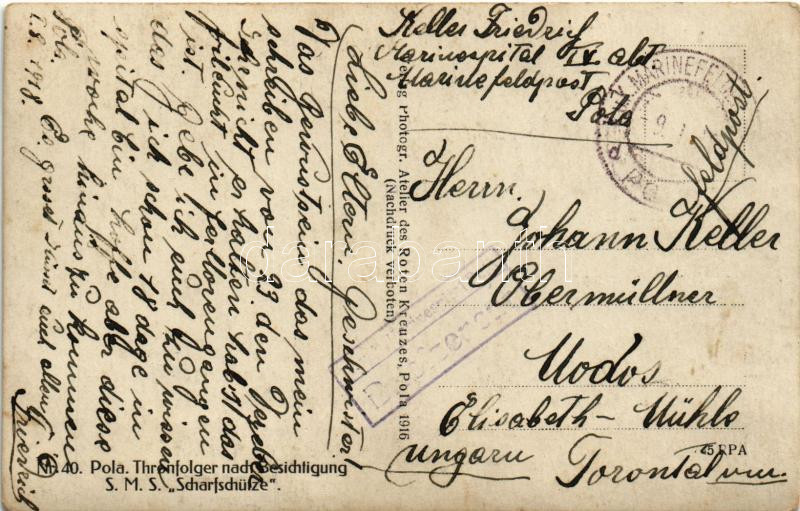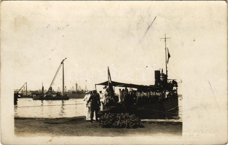 Thronfolger nach Besichtigung SMS Scharfschütze. K.u.K. Kriegsmarine / IV. Károly látogatása a polai dokkban, SMS Scharfschütze Osztrák-Magyar Haditengerészet Huszár-osztályú rombolója (Zerstörer), matrózok a fedélzeten / Charles I of Austria visits SMS Scharfschütze in the dock of Pola, mariners on board. Photogr. Atelier des Roten Kreuzes 1916.