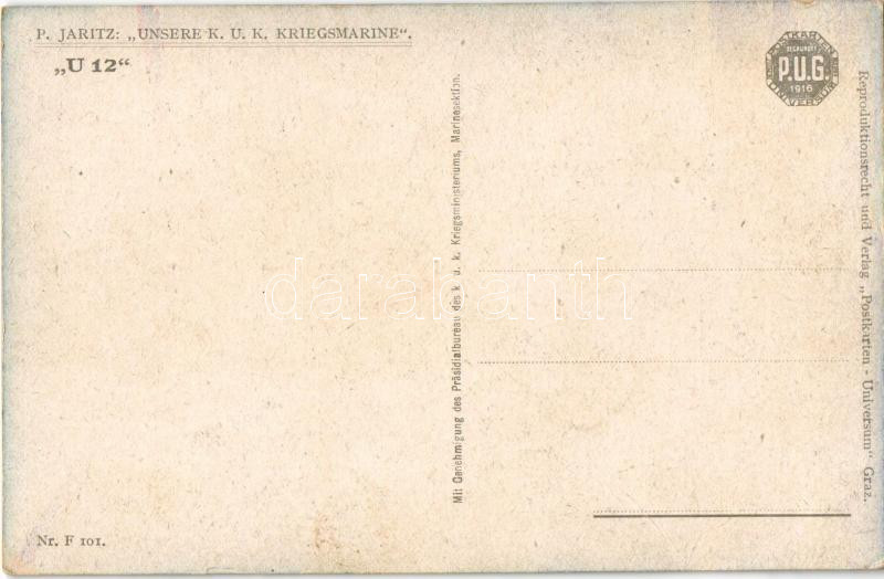 Description: Unsere K.u.K. Kriegsmarine: SM Unterseeboot U-12 (U-XII) / WWI Austro-Hungarian Navy art postcard, submarine SM U-12. P.U.G. Nr. F. 101. s: P. Jaritz (EK)