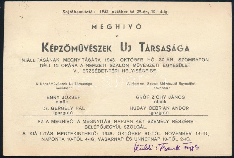 1943 Meghívó a Képzőművészek Új Társasága (KUT) Nemzeti Szalonbeli kiá... https://www.darabanth.com/en/458-Online-auction/458.0/Art-and-other-collectibles/Autographs~1000023/1943-Meghivo-a-Kepzomuveszek-Uj-Tarsasaga-KUT-Nemzeti-Szalonbeli-kiallitasara-Frank-Frigyes~II3067760