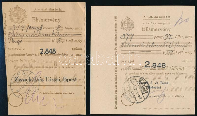 1927,1931 2db Zwack J. és Társai, Budapest Postatakarékpénztári elisme...