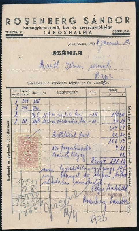 1938 Rosenberg Sándor bornagykereskedő, bor és szeszügynöksége, Jánoshalam fejléces számla asztali bor / vörös édes bor eladásáról