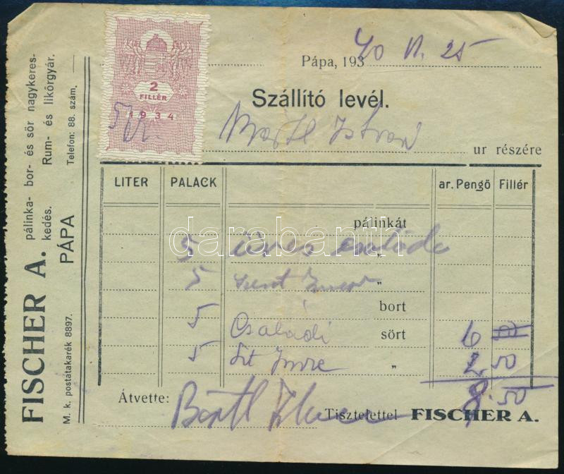 1940 Fischer A. pálinka-, Sör- és Bornagykereskedés - Rum és Likőrgyár, Pápa - Szállítólevél