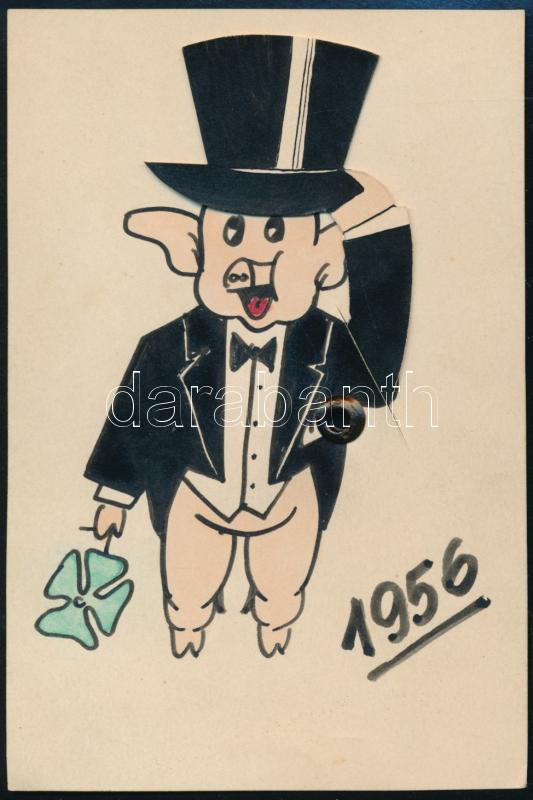 1956 Újévi malacos mechanikus üdvözlőlap, kézzel rajzolt, 12x8 cm