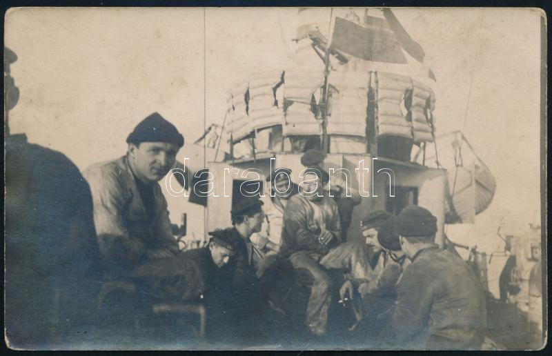 Description: cca 1915 Az S.M.S. Uskoke osztrák-magyar Huszár-osztályú romboló hadihajó legénysége. Fotólap / A group of sailors from S.M.S. Uskoke while the time away in the destroyer's aft deck.