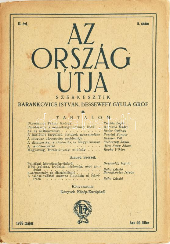 https://www.darabanth.com/en/458-Online-auction/458.0/Art-and-other-collectibles/Printed-Materials~1500039/Az-Orszag-Utja-1938-majusi-szam-Szerk-Barankovics-Istvan-Dessewffy-Gyula-Papirboritoban~II3064223