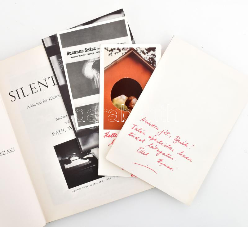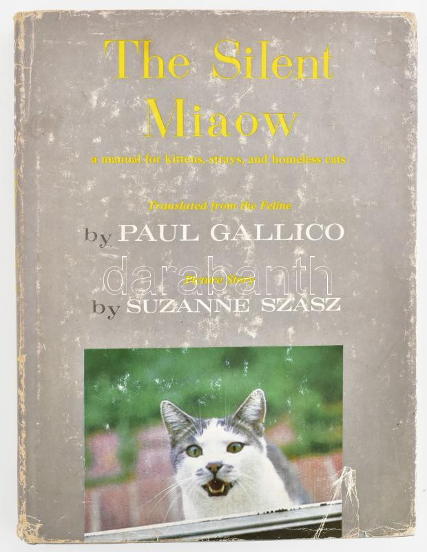 Gallico, Paul - Suzanne Szasz (Szász Zsuzsa): The Silent Miaow: Manual for Kittens, Strays and Homeless Cats. Picture story by Suzanne Szasz. New York, 1971. Crown. Kiadói vászonkötésben, kissé kopottas papírborítóval. Első kiadás. DEDIKÁLT! hozzá a szerző néhány aláírt és dedikált üdvözlőlapja. (Könyv macskákról, cicákról)