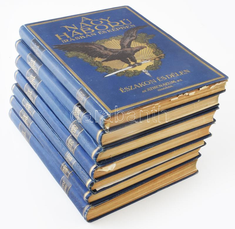 A Nagy Háború írásban és képben I-VII. kötet, teljes. Első rész: Északon és délen I-IV. Második rész: A nyugati hadszíntér I-II. kötet. Harmadik rész: Az olasz háború. Szerk.: Lándor Tivadar. Bp.,(1915-1926), Athenaeum. Rendkívül gazdag képanyaggal. Számos színes és fekete-fehér, részben kihajtható táblával, melléklettel, térképpel, több száz szövegközti képpel, térképvázlattal, rajzzal illusztrálva. Kiadói illusztrált, aranyozott egészvászon-kötésben, kopott borítóval, 3 kötetben kijáró lapokkal, valamint ezek közül az Északon és Délen I. kötetében javított kötéssel is.