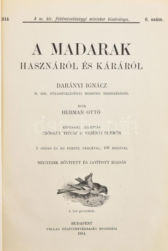 Herman Ottó: A madarak hasznáról és káráról. Darányi Ignácz m. kir. fö... https://www.darabanth.com/en/458-Online-auction/458.0/Books/Books-Natural-sciences-Medicine~1500023/Herman-Otto-A-madarak-hasznarol-es-kararol-Daranyi-Ignacz-m-kir-foldmivelesugyi-minister~II3066815