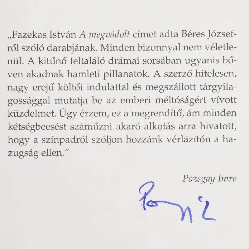 Description: Fazekas István: A megvádolt. Történelmi dráma három felvonásban. (DEDIKÁLT). Bp., 2015, Cédrus Művészeti Alapítvány - Napkút. Kiadói kartonált papírkötés, kiadói papír védőborítóban. A szerző, Fazekas István (1967- ) által DEDIKÁLT, illetve a védőborító hátoldalán Pozsgay Imre (1933-2016) politikus által aláírt példány!