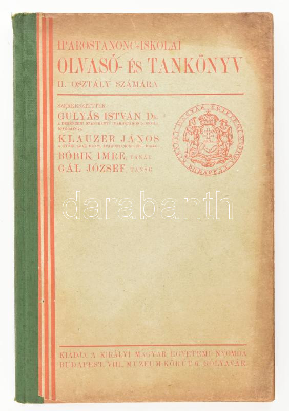 Description: Iparostanonc-iskolai Olvasó- és Tankönyv a II. Osztály számára. Szerk: Dr. Gulyás István, Klauzer János, Bóbik Imre, Gál József, Bp. é.n. Kir. Magyar Egyetemi Nyomda. Kopottas félvászon-kötésben, irredenta motívummal a hátlapján.