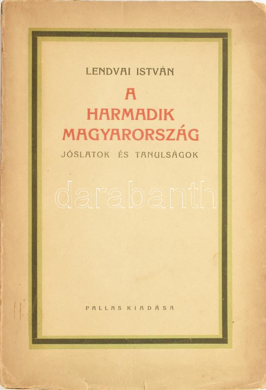 https://www.darabanth.com/en/458-Online-auction/458.0/Books/Books-Other-rarities~1500034/Lendvai-Istvan-A-harmadik-Magyarorszag-Bp-1921-Pallas-kisse-fakult-serult-kiadoi-papirkotes~II3064152
