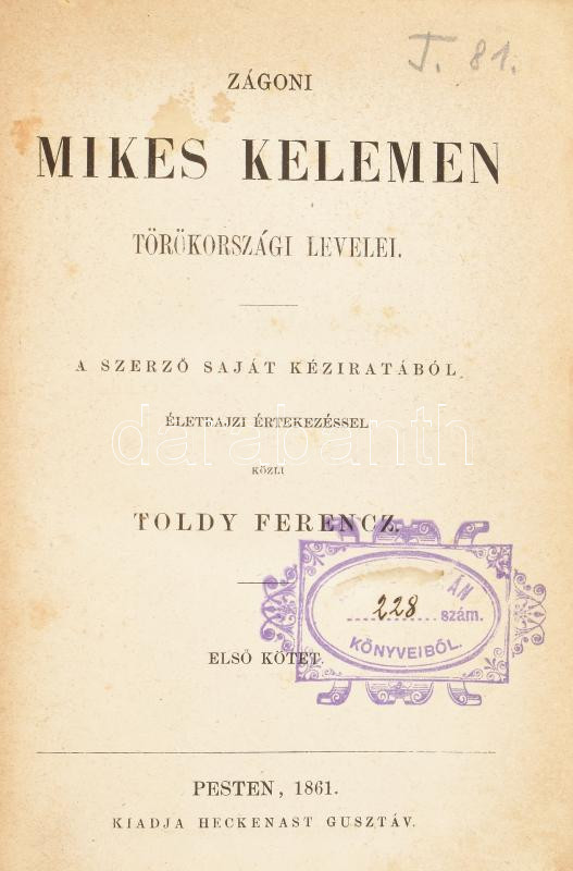 Zágoni Mikes Kelemen törökországi levelei. A szerző saját kéziratából életrajzi értekezéssel közli Toldy Ferencz. 1-2. kötet (egybekötve). Első kiadás! Pesten, 1861. Heckenast Gusztáv.
