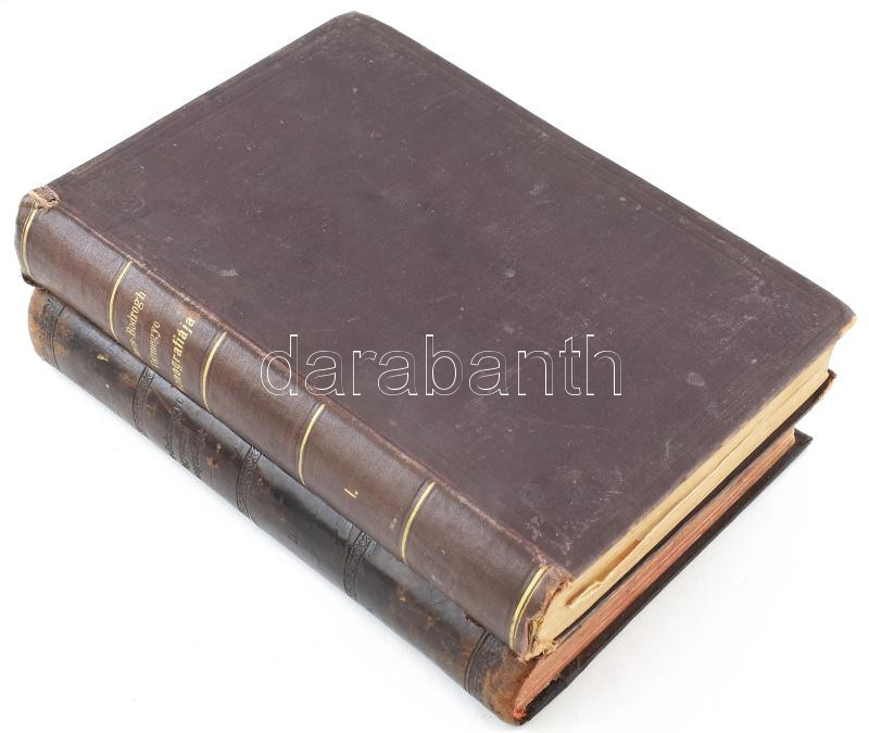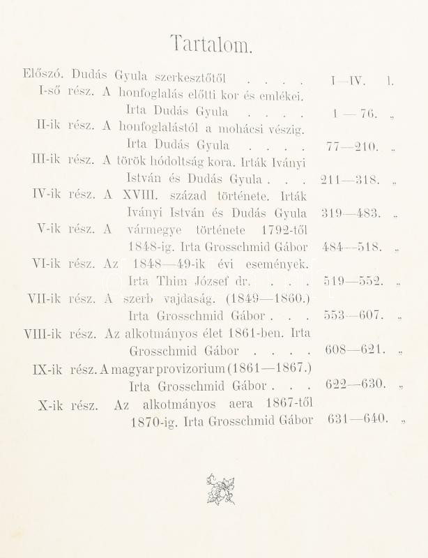 Bács-Bodrogh vármegye egyetemes monografiája. Hazánk ezredéves fennállásának ünnepe alkalmából kiadta Bács-Bodrogh vármegye közönsége. I-II. kötet. Zombor, 1896. Bittermann Nándor és Fia, IV+6+640 p. + 13 t. +1 (zentai csata térképe) t.; VII+5+613+1 p. + 8 t. + 2 (kihajt. mell.) Egészvászon-kötés, és félbőr-kötés, kopott borítóval, foltos lapokkal, néhány lapon javítással, az I. kötet gerincén kis sérüléssel, a II. kötetben régi bélyegzésekkel és azonosítatlan ajándékozási sorokkal (dedikáció?), és névbejegyzésekkel, néhány ceruzás bejelöléssel, az I. kötetből: a színes címkép (vármegye címere), a címlap, valamint Bács-Bodrogh vármegyék a mohácsi vész előtt színes térkép, és a II. kötetből: 6 kihajtható melléklet és a színes vármegye térkép hiányzik, valamint az I. kötetben a zentai csata térképe szakadt.