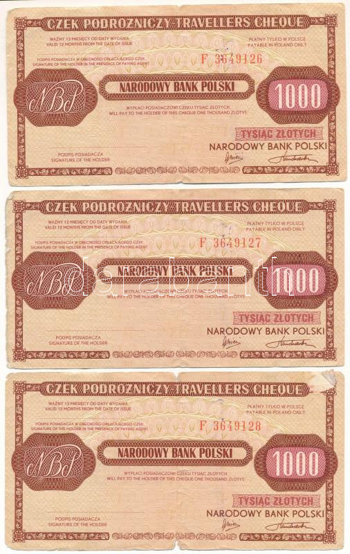 Poland 1985. 1000 Zlotych "Narodowy Bank Polski" travellers cheque, with "Magyar Nemzeti Bank Emissziós Főosztály" overprint on the backside (3pcs) consecutive serials C:F,VG