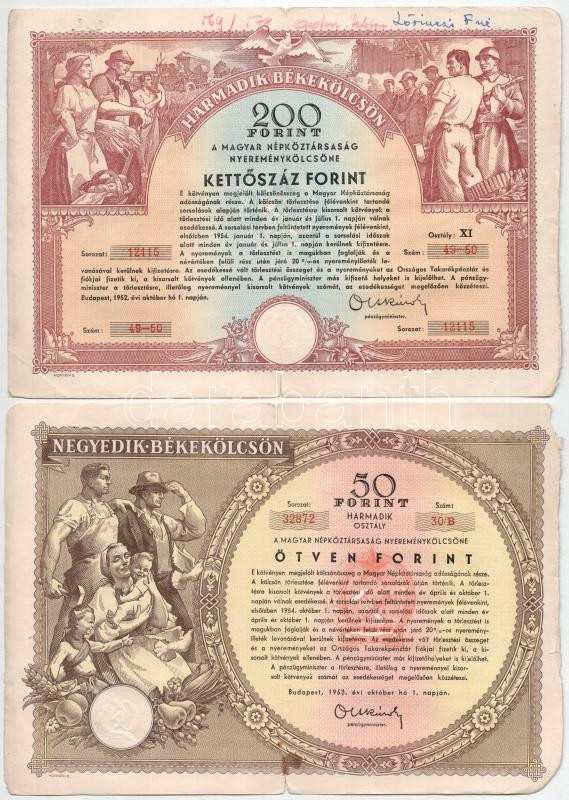 Budapest 1952-1954. 4xklf békekölcsön kötvény, közte: "Harmadik Békekö...