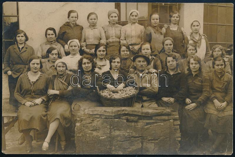 1923 A Tokaji Palackozó dolgozói egy kosár dugóval, fotó, 9,5×14,5 cm