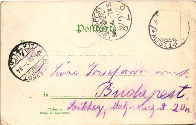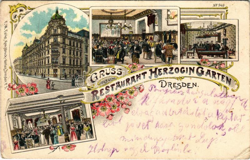 1905 Dresden, Gruss aus dem Restaurant Herzogin Garten / restaurant interior, pool tables. Art Nouveau, floral, litho (EK)