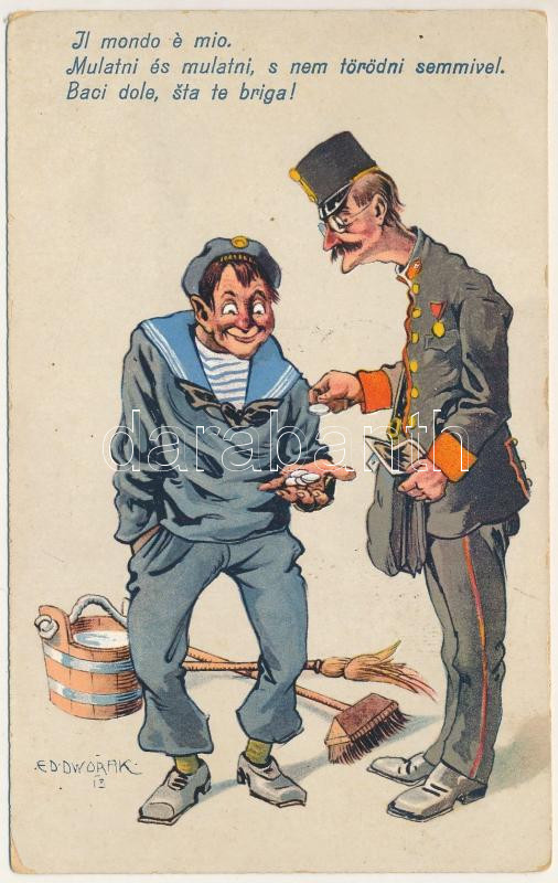 Description: Il mondo e mio / Mulatni és mulatni, s nem törődni semmivel / Baci dole, sta te briga / K.u.K. Kriegsmarine Matrosen / WWI Austro-Hungarian Navy mariner humor. C. Fano Pola 24. 1914/15. s: Ed. Dworak + "K.u.K. Fest. Art. Baon Nr. 3. 9. Feldkompagnie" (kopott sarkak / worn corners)