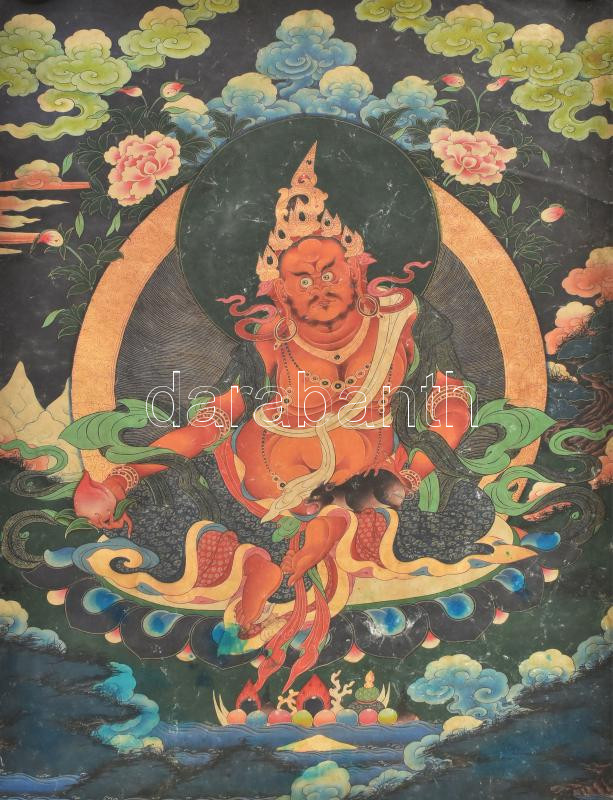 Thangka, Jambhala ábrázolással. Kína, XX. sz. első fele, nyomat, vászon. 89x64 cm, korának megfelelő állapotban, hátul kopott, foltos, feltekerve.