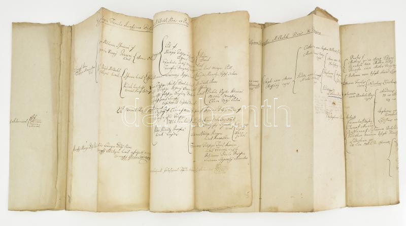1799 A Patay, Jánossy, Dorogfy, Koós és egyéb erdélyi családok családfái 9-10 nagy méretű Kb 65x45 cm oldalon kézzel írva, rajzolva