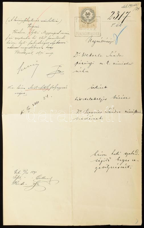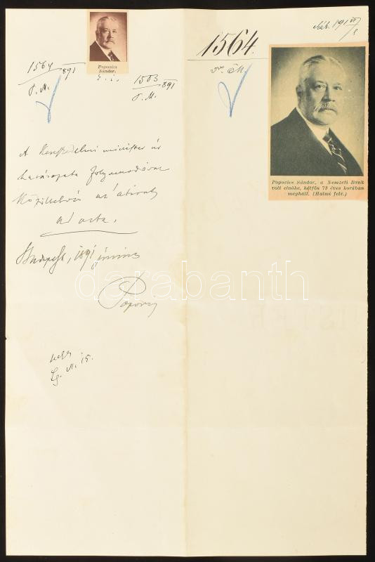 Description: 1891 Popovics Sándor (1862-1935) politikus autográf sorai, és aláírása egy iraton, rajta Popovics Sándor arcképeivel. Popovics Sándor később az Osztrák-Magyar Bank főkormányzója (1909-1918), majd pénzügyminiszter (1918), majd a Magyar Nemzeti Bank 1. elnöke (1924-1935.) Benne Wekerle Sándorhoz intézett kérelmének jegyzet részérével, de a kérelem nélkül, 50 kr. okmánybélyeggel.