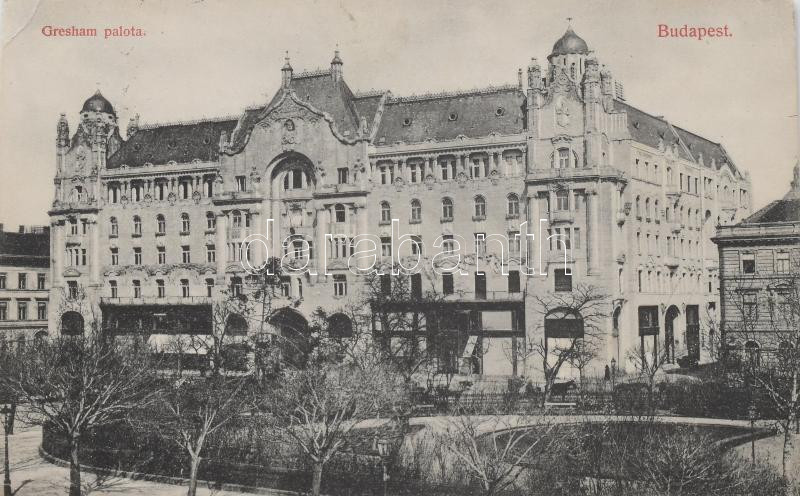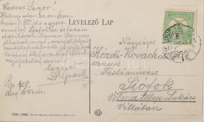 Description: 1908 Kézdi-Kovács László (1864-1942) festőművész, műkritikus részére, a sógora, Dr. Graul álta Budapestről Siófokra küldött képeslap. Hátoldalán a Budapesti Gresham palotával.
