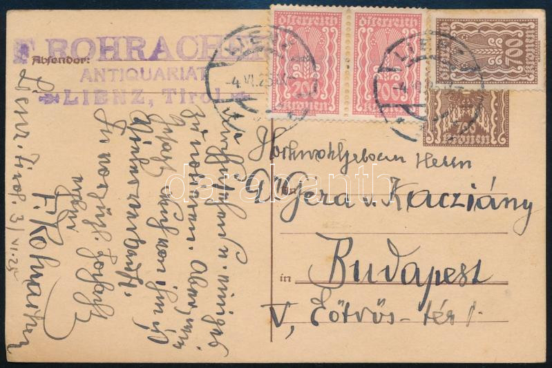 1925 F. Rohracher lienzi antikvárius autográf képeslapja Kacziány Géza (1856-1939) bölcseleti doktor, Ãró, műfordÃtó részére, német nyelven. FeltehetÅ‘leg szakmai, "könyves" ügyben.