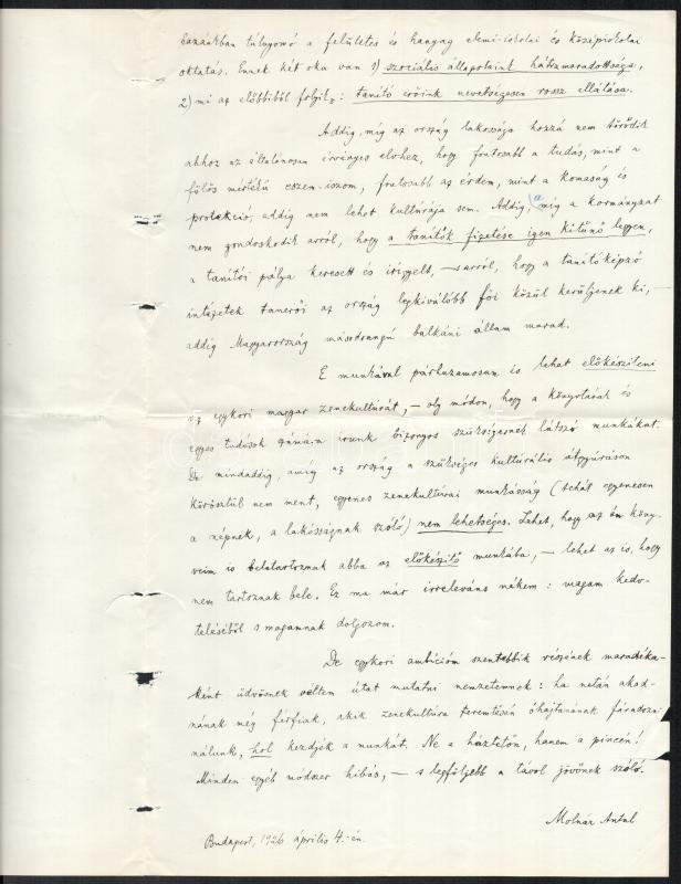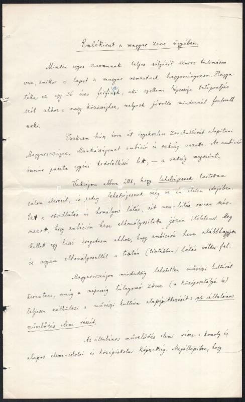 1926 Molnár Antal (1890-1983) zenetörténész, zeneszerzÅ‘ és zeneesztéta, brácsaművész "Emlékirat a magyar zene ügyében" c. Ãrásának kézirata, két beÃrt oldal, autográf aláÃrásával.