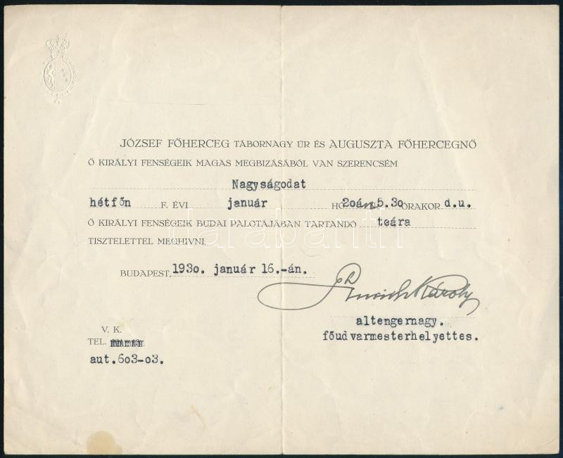 1930 Habsburg József Ágost (1872-1962) főherceg, tábornagy és Auguszta főhercegnő meghívója teára, címeres papíron, Lucich Károly (1868-1962) altengernagy, főudvarmester autográf aláírásával.
