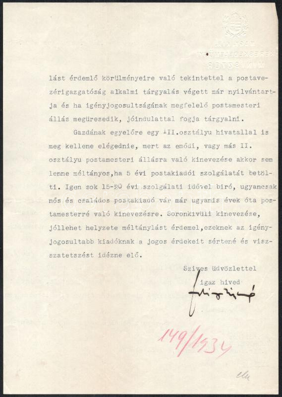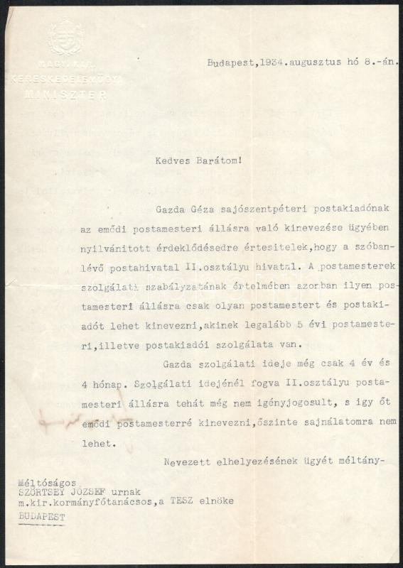 1934 Bp., Fabinyi Tihamér (1890-1953) jogász, politikus, kereskedelem- és közlekedésügyi miniszter (1932-1935) autográf aláírása Szörtsey József kormányfőtanácsosnak címzett, gépelt levelén (postamesteri kinevezés tárgyában), 2 beírt oldal, "Magy. Kir. Kereskedelemügyi Miniszter" dombornyomott fejléces papíron