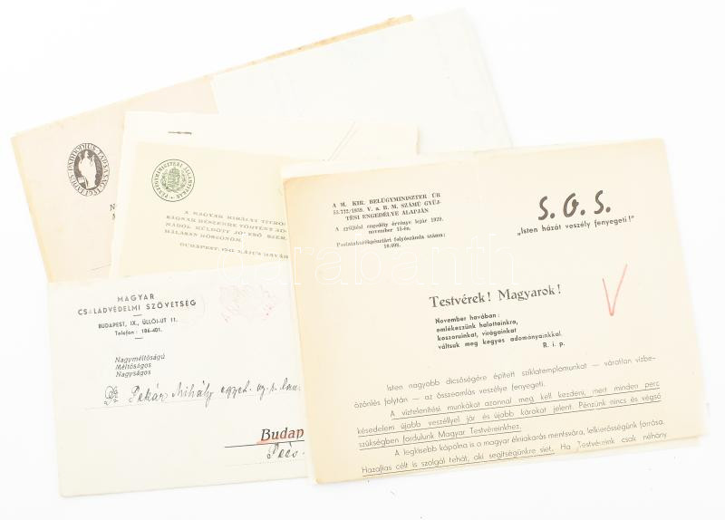 1937-1939 Pekár Mihály (1871-1942) orvos, fiziológus, egyetemi tanár hagyatékból származó meghívók, üdvözlőlapok, stb., össz. 10 db, közte érdekes darabokkal: Szász Lajos (1888-1946) pénzügyminiszteri államtitkár (később iparügyi, ill. kereskedelem- és közlekedésügyi miniszter) autográf aláírásával ellátott üdvözlőlap; fáji Fáy Ödön m. kir. rep. főhadnagy és felesége, Rőmer Margit által aláírt esküvői meghívó; Dr. Kenessey Aladár (1872-1971) főorvos, Pécsi Szemészeti Klinika alapítójának saját kezű köszönő levele; Birkás Géza (1879-1951), a pécsi Magyar Királyi Erzsébet Tudományegyetem rektora által aláírt levél; stb.
