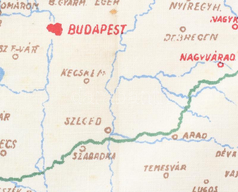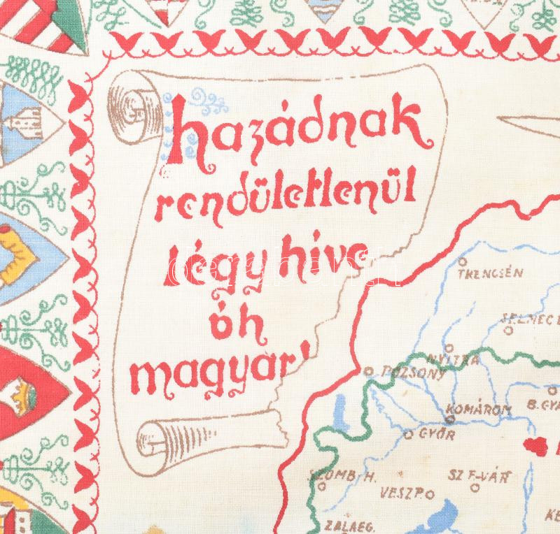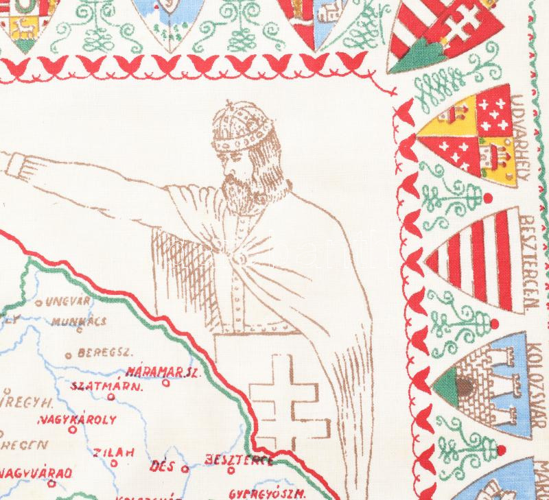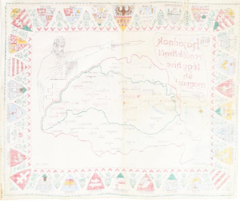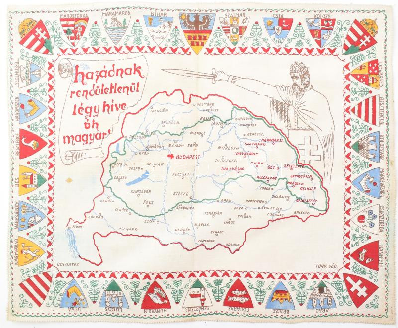 Description: 1940 "Hazádnak rendületlenül légy híve óh magyar, 1940. aug. 30.", Nagy-Magyarországot és a történelmi megyecímereket ábrázoló selyem kendő (zöld körvonallal Magyarország a II. világháború során visszacsatolt területekkel), az Erdélyi bevonulás emlékére, 35x34 cm