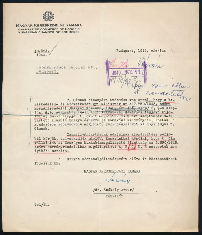 1949 Bp., a Magyar Kereskedelmi Kamara levele a Csonka János Gépgyár Rt. részére kamarai taggá választásról, Székely Artúr főtitkár aláírásával