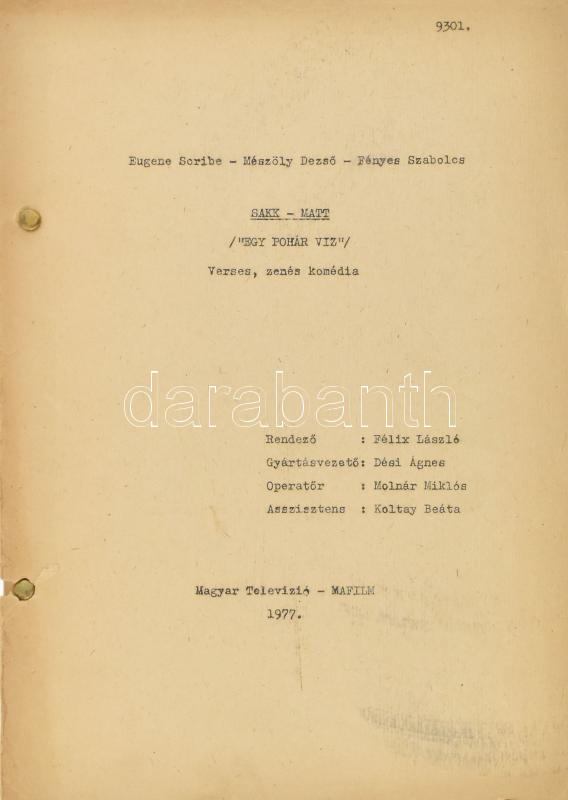 1977 Eugene Schribe - Mészöly Dezső - Fényes Szabolcs: Sakk - Matt. /"Egy pohár víz."/ Verses, zenés komédia. Rendező: Félix László, operatőr: Molnár Miklós. Forgatókönyv. Bp., Magyar Televízió - MAFILM. Papírkötés, szakadt címlappal.