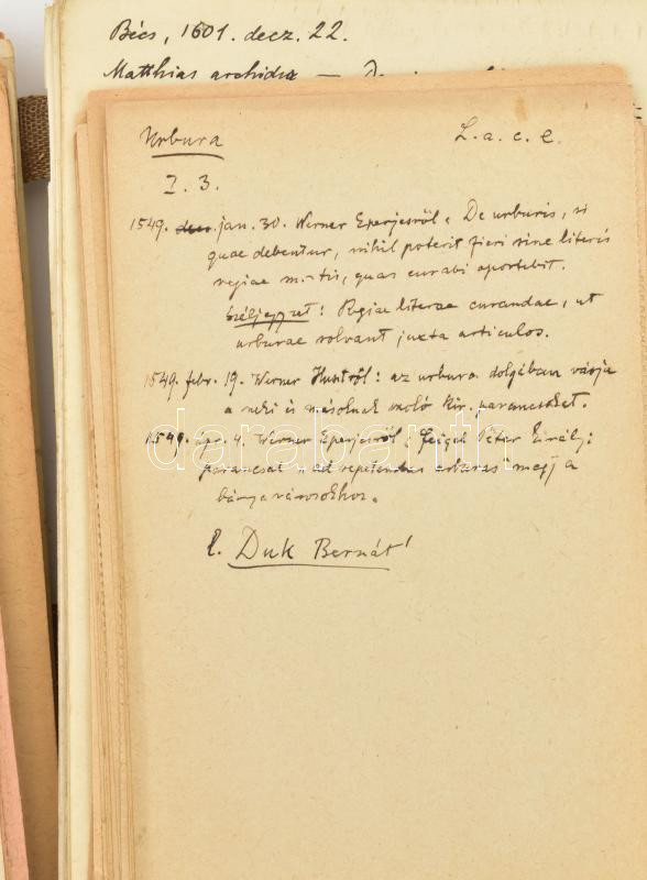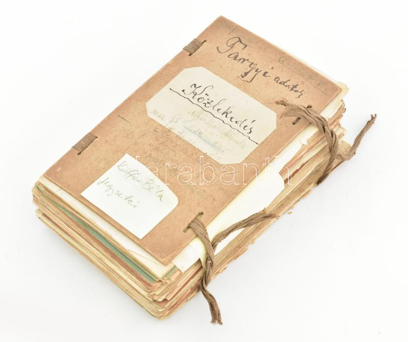 Küffer Béla (1856-1928) a képviselőház könyvtárnokának kézzel írt jegyzetei, előadás töredékei, tárgyi feljegyzései változatos témákban. Több mint száz lap mappában 11x18 cm