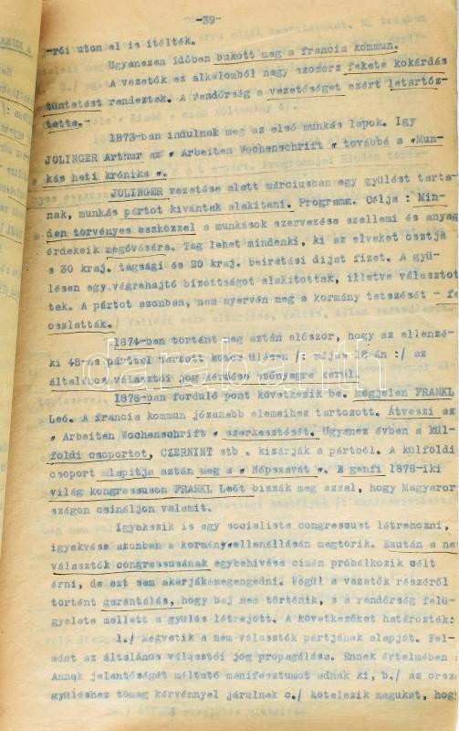 cca 1920 Cziegler: A munkásmozgalom fejlődése, gépirat, bejelölésekkel, aláhúzásokkal, szakadozott, foltos.