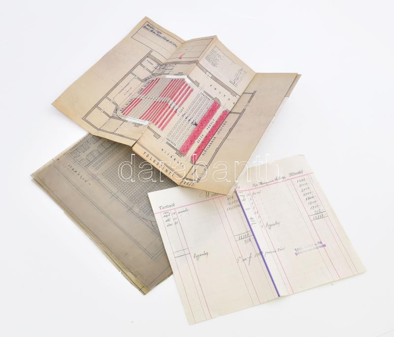 Description: cca 1929 Winkler Lajos, a Délibáb Filmszínház (Bp. XIII., Róbert Károly krt. 61.) tulajdonosának iratai (3 db): 2 db tervrajz / alaprajz a mozi elrendezéséről + Lingel Károly és Fiai Első Magyar Faáru- és Bútorgyár által kiállított számla, változó méretben és állapotban