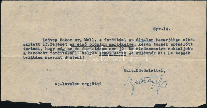 cca 1950? évek gróf Széchenyi Zsigmond (1898-1967) vadász, utazó, író autográf aláírással ellátott, gépelt levele Bokor Dezső (1894-1963) szerkesztő, kiadó részére, benne: megküldött fordítás ügyében. Miszerint még az ő fordítása se jó, de jobb mint a bekötött, amit semmi esetre sem küldene ki. hn., április 14.