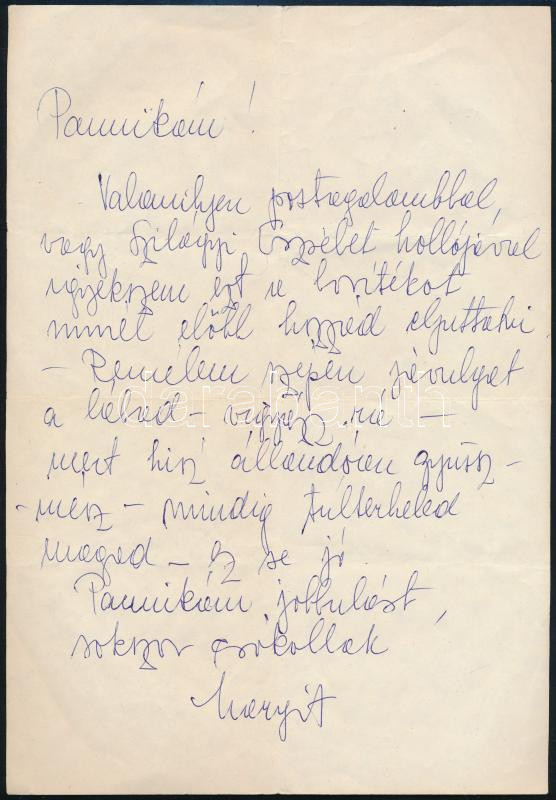 Description: cca 1960-1970 Kovács Margit (1902-1977) Kossuth-díjas keramikus saját kézzel írt levele, Baksa-Soós Anna részére, saját kezű aláírásával, 1 beírt oldal.